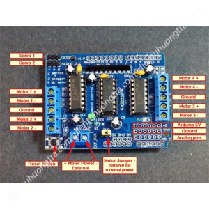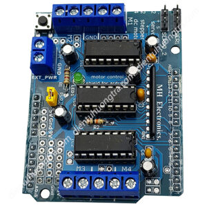 - Arduino Motor Shield L293D là một phần board mở rộng cho các board arduino, dùng để điều khiển các loại động cơ DC, động cơ bước và động cơ servo.Arduino Motor Shield được thiết kế gọn gàng, đẹp mắt và tương thích hoàn toàn với các board Arduino: arduino uno r3, arduino leonardo, arduino mega2560, giúp bạn có thể sử dụng và điều khiển một cách dễ dàng và nhanh chóng.