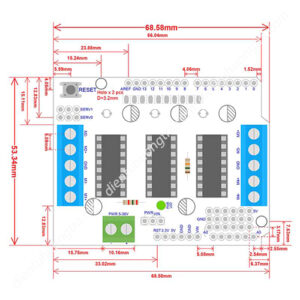 - Arduino Motor Shield L293D Điện áp đầu vào: 4.5V đến 36V. Tương thích với các board Arduino Uno R3, Arduino Leonardo R3 và Arduino Mega 2560
